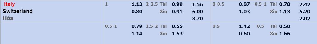 - Mức kèo nhà cái cược chấp trận này: Italy chấp 1 trái. Italy ăn 1,13. Thụy Sĩ ăn 0,80