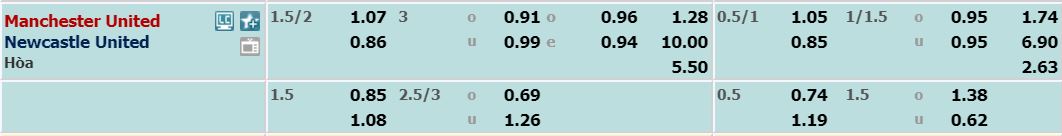 - Mức kèo bóng đá cược chấp nhà cái đưa ra cho cả trận: Manchester Utd chấp 1,75 Trái. Manchester Utd ăn 1,07. Newcastle Utd ăn 0,86.