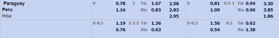- Mức kèo nhà cái cược chấp trận này: Hòa – Được – Thua. Paraguay ăn 0,78. Peru ăn 1,17