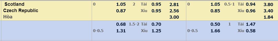 - Mức kèo nhà cái cược chấp trận này: Hòa – Được – Thua. Scotland ăn 1,05. Cộng hòa Séc ăn 0,87