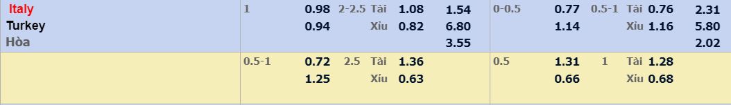 - Mức kèo nhà cái cược chấp trận này: Italy chấp 1 Trái. Italy ăn 0,98. Thổ Nhĩ Kỳ ăn 0,94