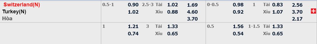 - Mức kèo nhà cái cược chấp trận này: Thụy Sĩ chấp 0,75 trái. Thụy Sĩ ăn 0,90. Thổ nhĩ Kỳ ăn 1,02