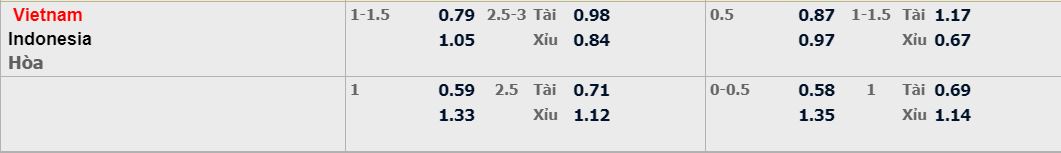- Mức kèo nhà cái cược chấp trận này: Việt Nam chấp 1,25 Trái. Việt Nam ăn 0,79. Indonesia ăn 1,05